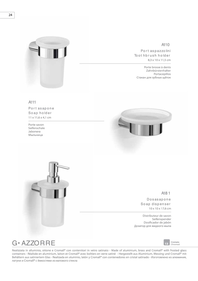 Realizzata in alluminio, ottone e Cromall® con contenitori in vetro satinato - Made of aluminium, brass and Cromall® with frosted glass