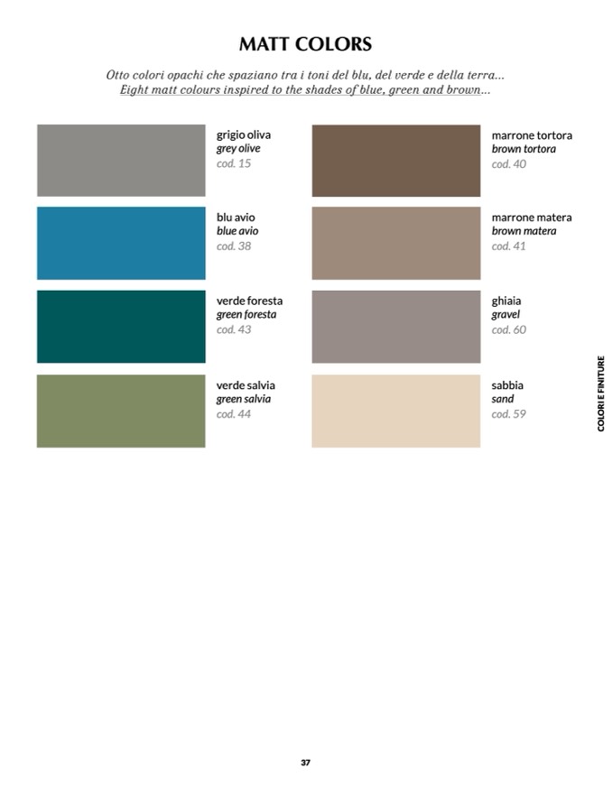 Otto colori opachi che spaziano tra i toni del blu, del verde e della terra...