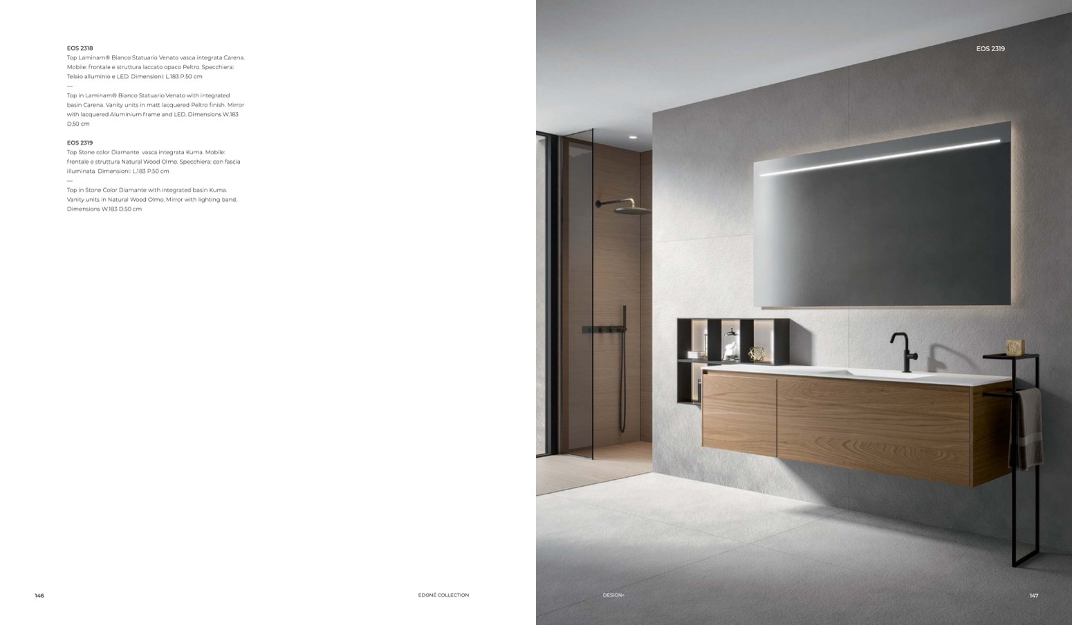 Vanity units in Natural Wood Olmo. Mirror with lighting band.