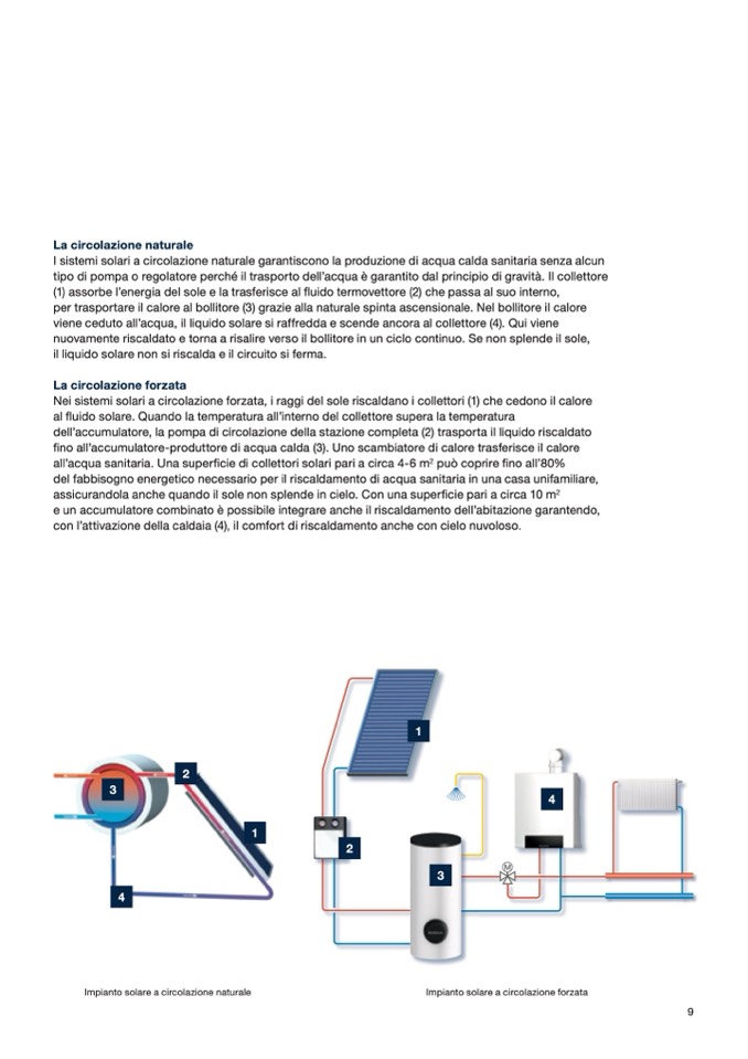 Nei sistemi solari a circolazione forzata, i raggi del sole riscaldano i collettori (1) che cedono il calore
