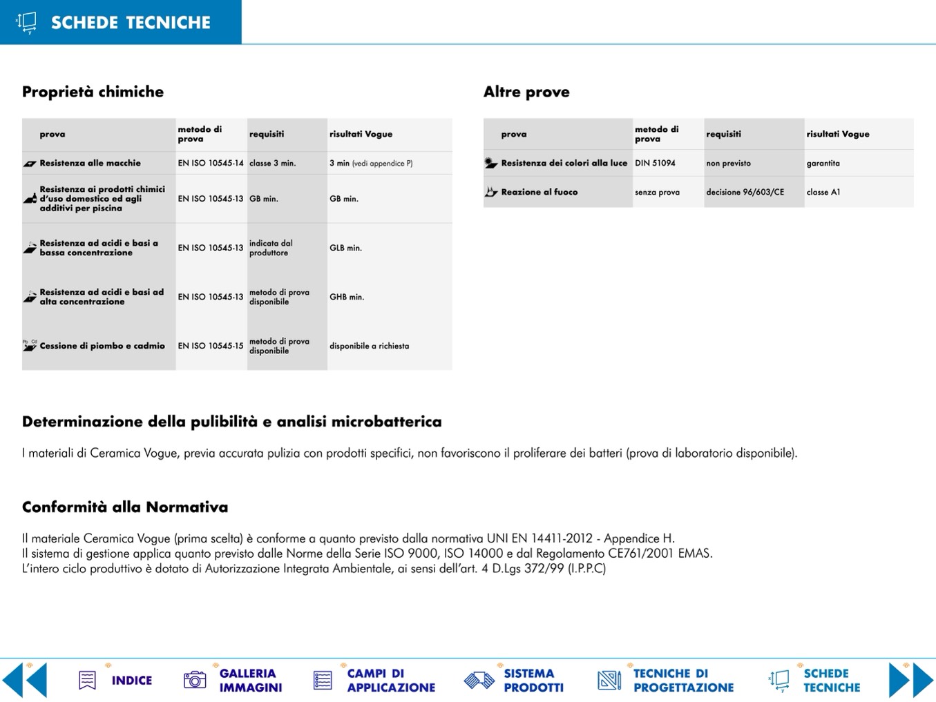 Il materiale Ceramica Vogue (prima scelta) è conforme a quanto previsto dalla normativa UNI EN 14411-2012 - Appendice H.