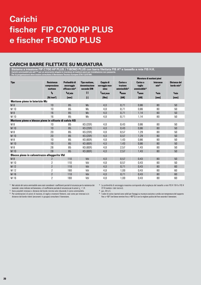 I valori di carico riportati sono validi per fissaggi su muratura asciutta e umida con temperatura del supporto