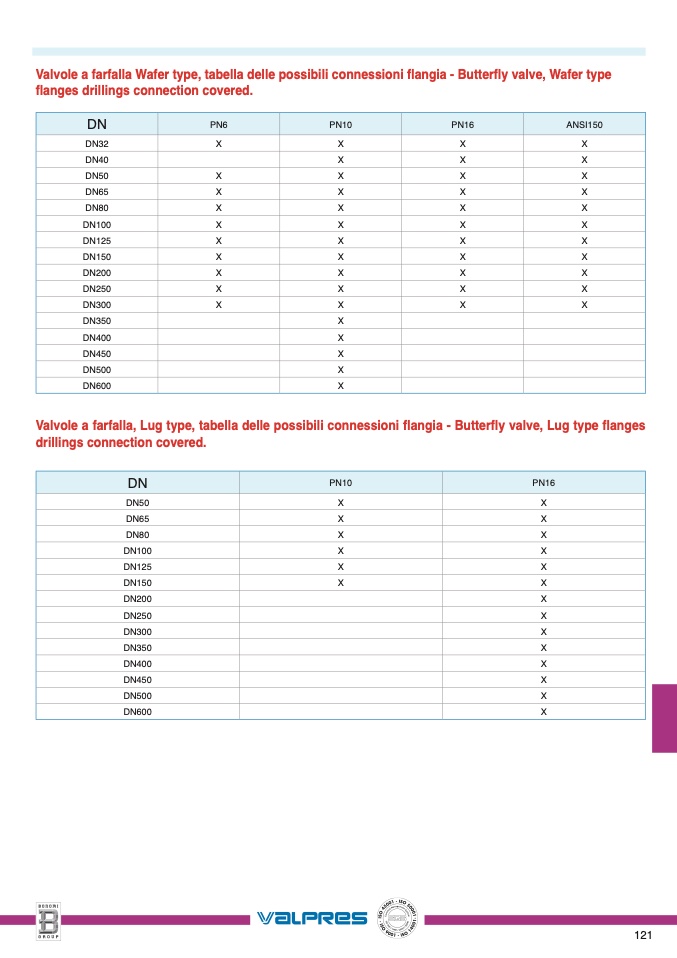 Valvole a farfalla Wafer type, tabella delle possibili connessioni flangia - Butterfly valve, Wafer type