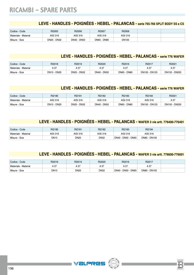 LEVE - HANDLES - POIGNÉES - HEBEL - PALANCAS - serie 765-766 SPLIT BODY SS e CS
