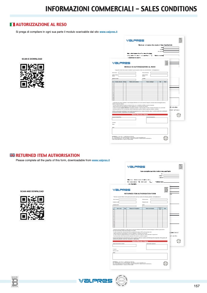 - In caso di resi per sospetta difettosità è necessario compilare, in ogni sua parte, il modulo "richiesta informazioni non conformità".