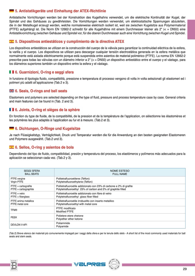 (Tab.2) Breve elenco dei materiali più comunemente impiegati per i seggi della sfera e per le tenute dello stelo - A short list of the most commonly used materials for ball