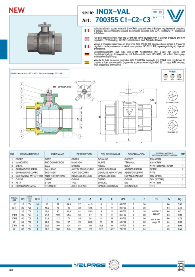 Valvola a sfera in acciaio inox AISI 316-CF8M dotata di sfere V-Ball per regolazione di pressione