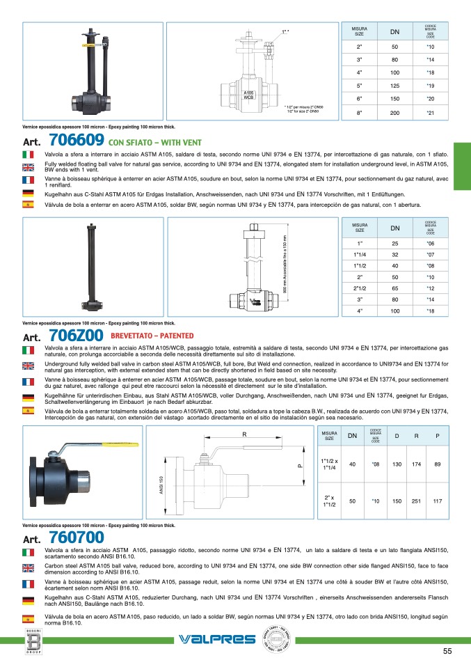 Valvola a sfera a interrare in acciaio ASTM A105/WCB, passaggio totale, estremità a saldare di testa, secondo UNI 9734 e EN 13774, per intercettazione gas