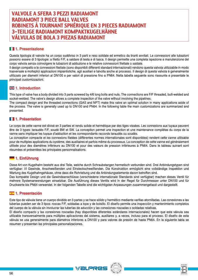 the process. The valve is generally used up to DN100 and PN64. In the following table the main customizations are summarized and