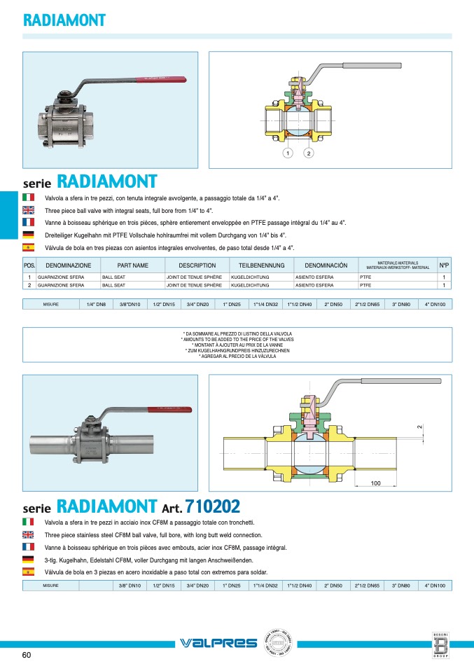 Valvola a sfera in tre pezzi, con tenuta integrale avvolgente, a passaggio totale da 1/4” a 4”.
