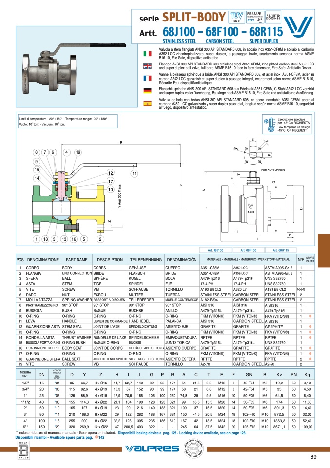 and super duplex ball valve, full bore, ASME B16.10 face to face dimension, Fire Safe, Antistatic Device.