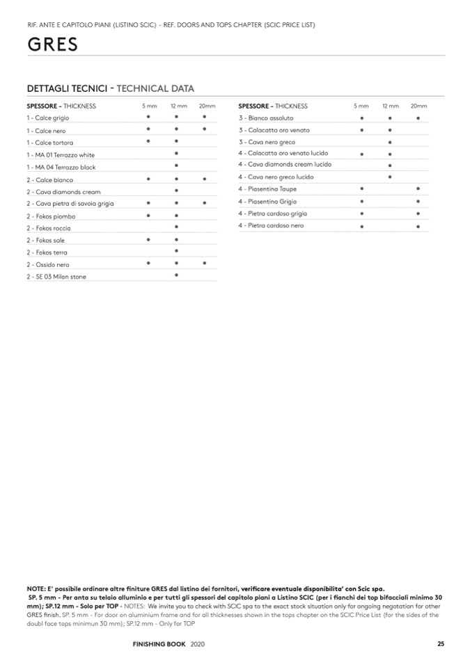 NOTE: E’ possibile ordinare altre finiture GRES dal listino dei fornitori, verificare eventuale disponibilita’ con Scic spa.