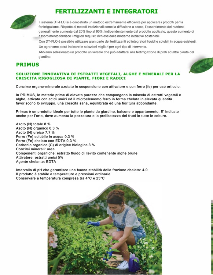 Con DT-FLO è possibile utilizzare gran parte dei fertilizzanti ed integratori liquidi e solubili in acqua esistenti.