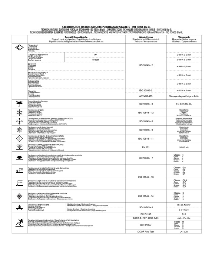 TECHNISCHE EIGENSCHEFTEN GLASIERTES FEINSTEINZEUG - ISO 13006 Bla GL . ТЕХНИЧЕСКИЕ ХАРАКТЕРИСТИКИ ГЛАЗУРОВАННОГО КЕРАМОГРАНИТА - ISO 13006 Bla GL