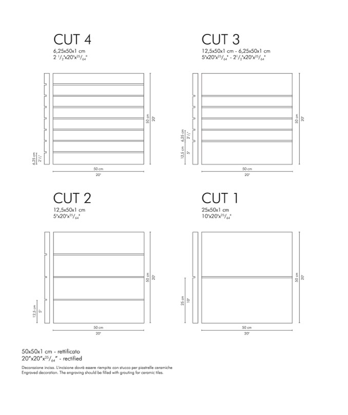 Engraved decoration. The engraving should be filled with grouting for ceramic tiles.