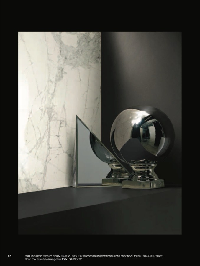 wall: mountain treasure glossy 160x320 63”x126” washbasin/shower: florim stone color black matte 160x320 63”x126”
