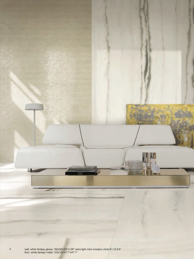 wall: white fantasy glossy 160x320 63”x126” extra light mink mosaico circle Ø 1,8 3/4”
