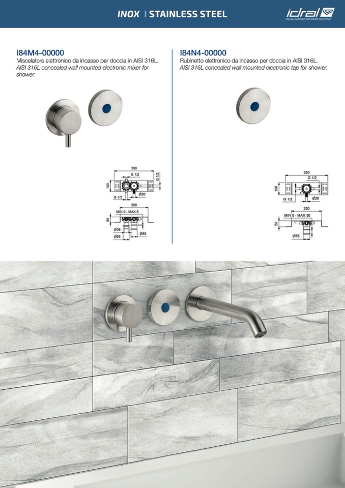 Rubinetto elettronico da incasso per doccia in AISI 316L.