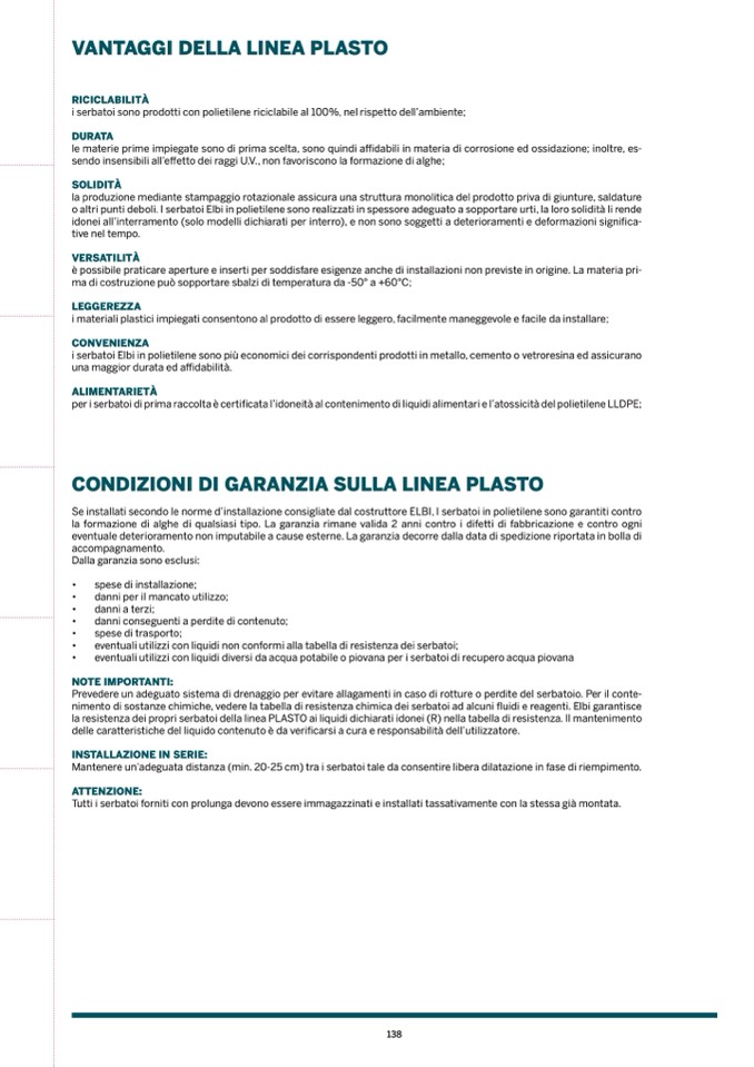 Se installati secondo le norme d’installazione consigliate dal costruttore ELBI, I serbatoi in polietilene sono garantiti contro