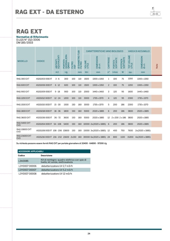 Su richiesta possono essere forniti RAG EXT per portate giornaliere di 32400 - 64800 - 97200 l/g