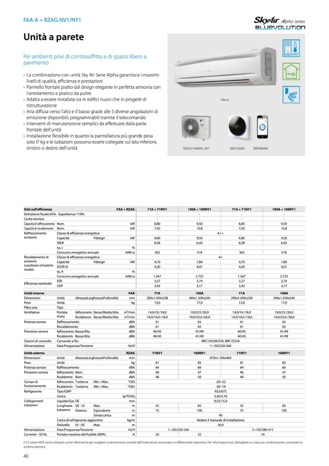 (1) Il valore MFA viene utilizzato come riferimento per scegliere la dimensione corretta dell'interruttore automatico e differenziale (salvavita). Per informazioni più dettagliate su ciascuna combinazione, consultare lo