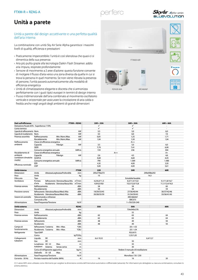 (1) Il valore MFA viene utilizzato come riferimento per scegliere la dimensione corretta dell'interruttore automatico e differenziale (salvavita). Per informazioni più dettagliate su ciascuna combinazione, consultare lo