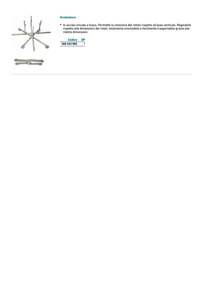 In acciaio zincato a fuoco. Permette la rotazione del rotolo rispetto all'asse verticale. Regolabile