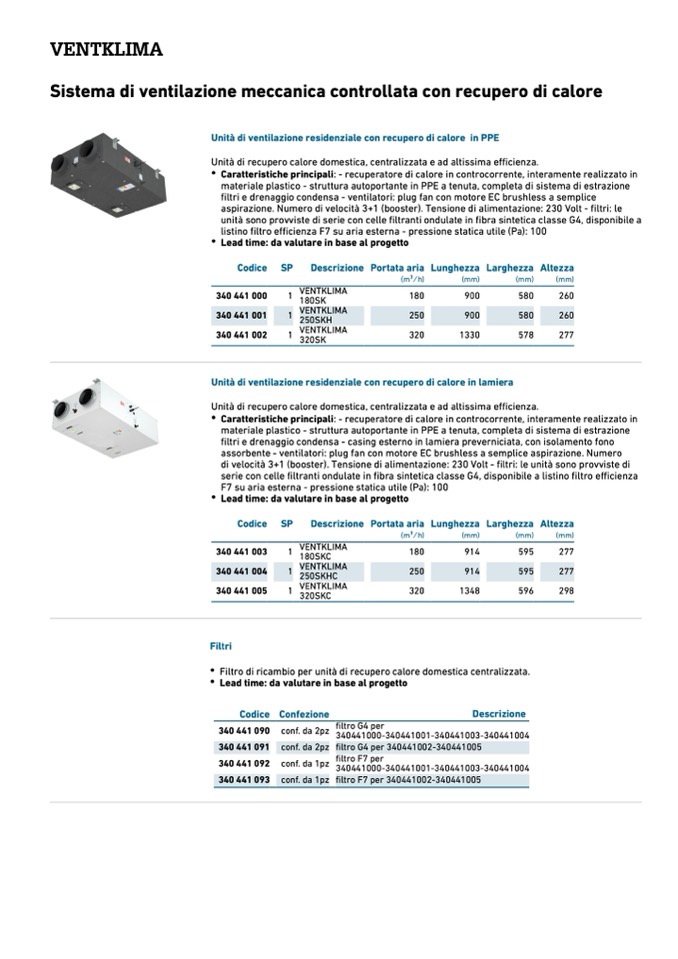 di velocità 3+1 (booster). Tensione di alimentazione: 230 Volt - filtri: le unità sono provviste di
