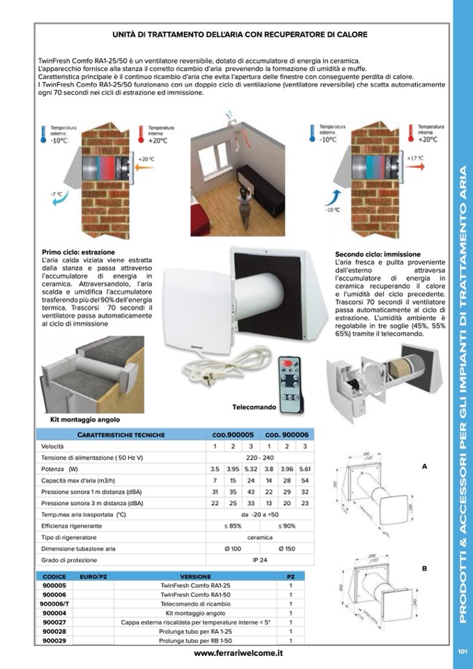 TwinFresh Comfo RA1-25/50 è un ventilatore reversibile, dotato di accumulatore di energia in ceramica.