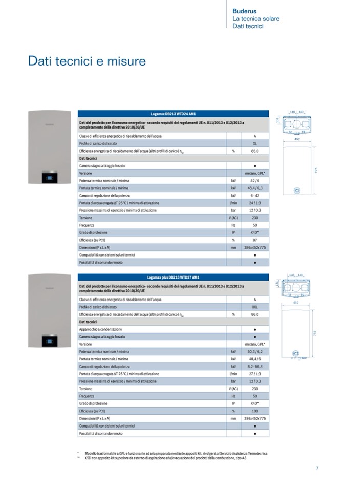 * Modello trasformabile a GPL e funzionante ad aria propanata mediante appositi kit, rivolgersi al Servizio Assistenza Termotecnica