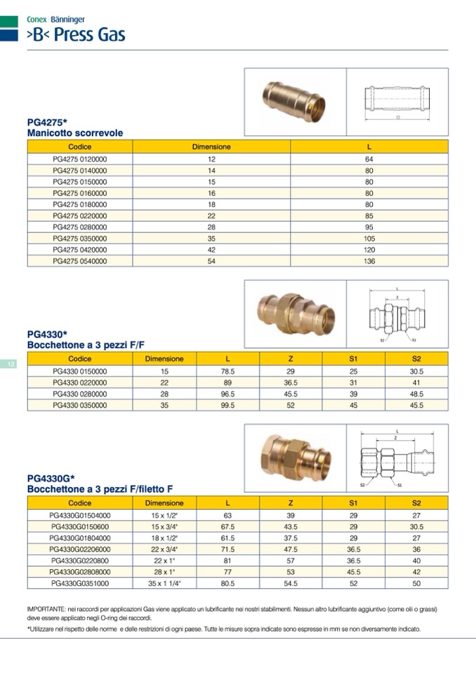 IMPORTANTE: nei raccordi per applicazioni Gas viene applicato un lubrificante nei nostri stabilimenti. Nessun altro lubrificante aggiuntivo (come olii o grassi)