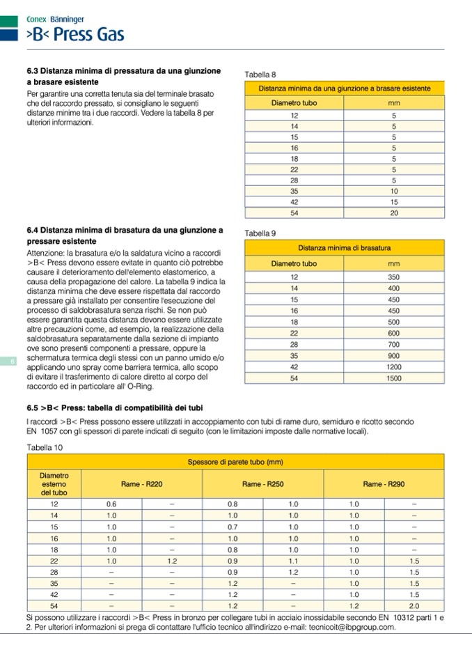 I raccordi >B< Press possono essere utilizzati in accoppiamento con tubi di rame duro, semiduro e ricotto secondo