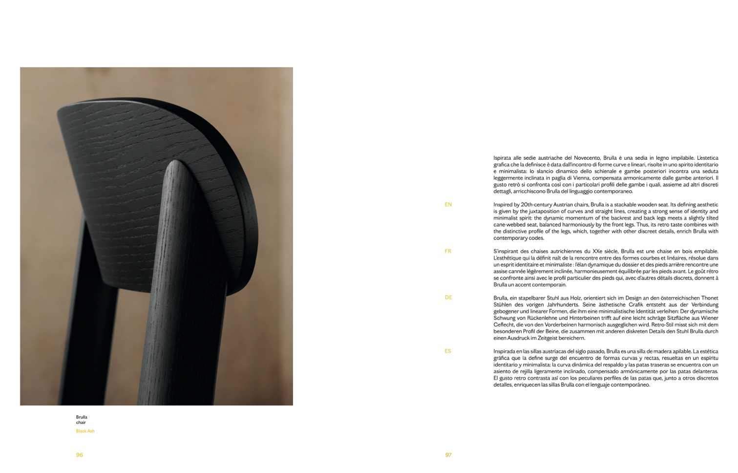Ispirata alle sedie austriache del Novecento, Brulla è una sedia in legno impilabile. L'estetica