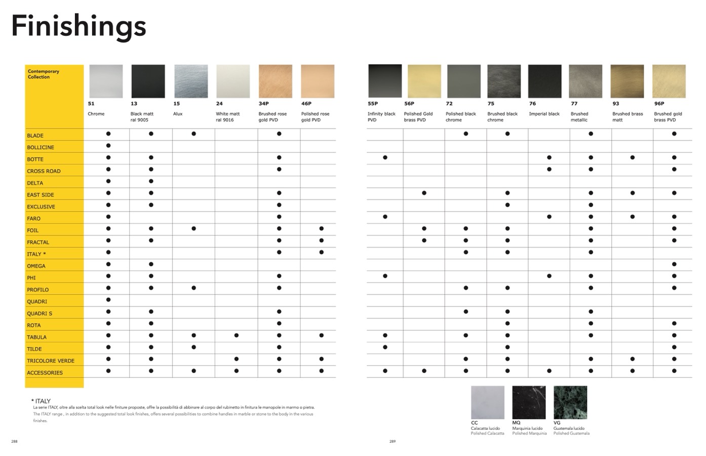 The ITALY range , in addition to the suggested total look finishes, offers several possibilities to combine handles in marble or stone to the body in the various