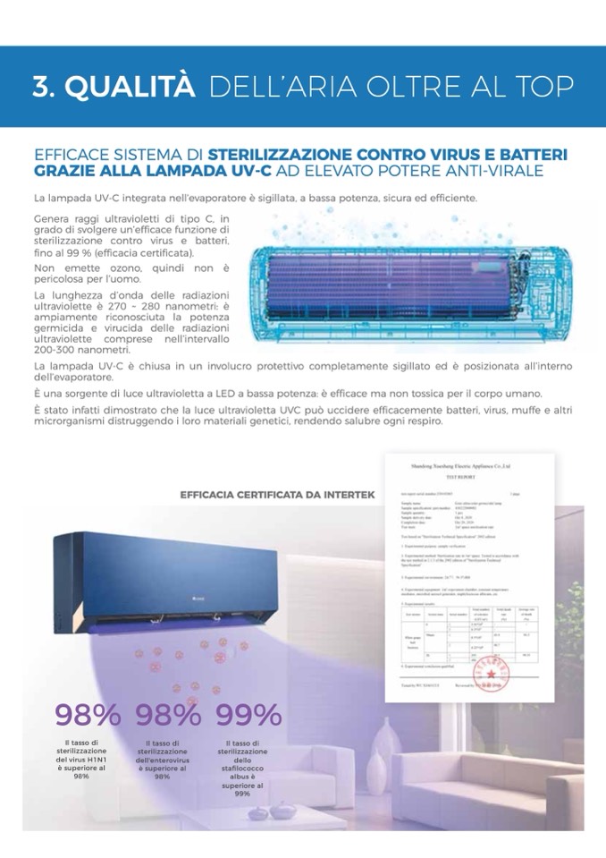 La lampada UV-C integrata nell’evaporatore è sigillata, a bassa potenza, sicura ed efficiente.