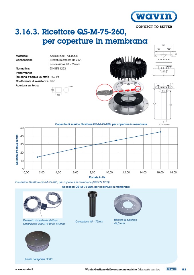 Capacità di scarico Ricettore QS-M-75-260, per coperture in membrana
