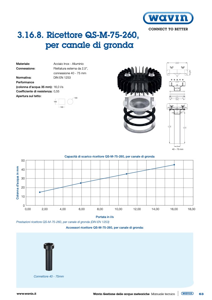 Capacità di scarico ricettore QS-M-75-260, per canale di gronda