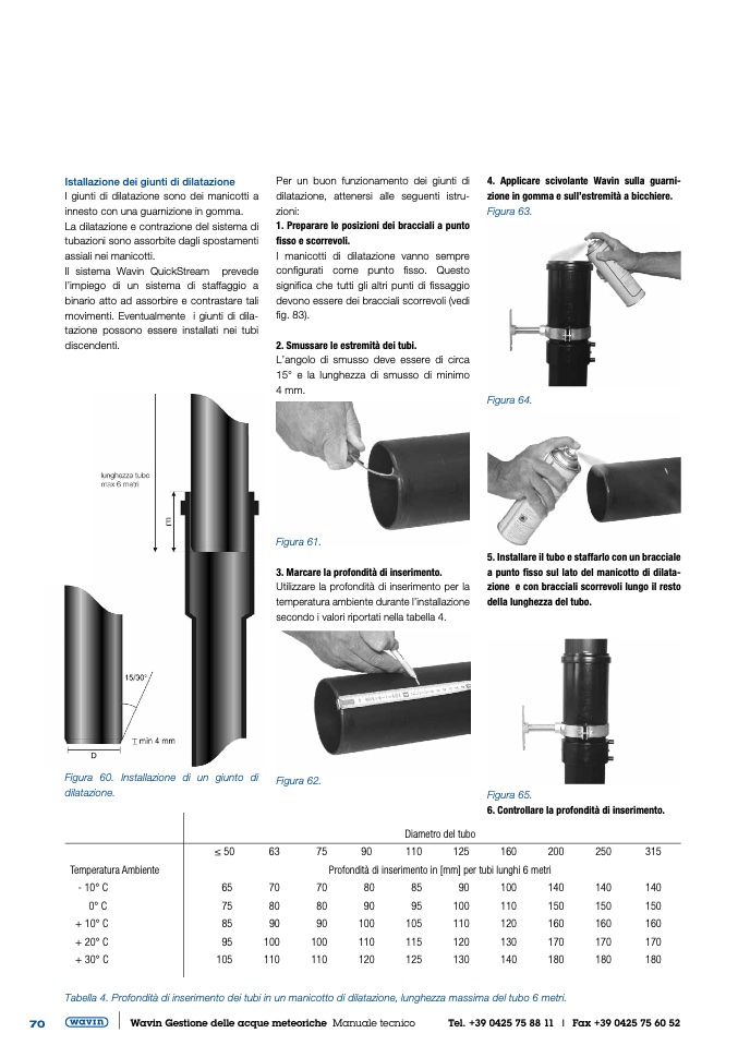 Tabella 4. Profondità di inserimento dei tubi in un manicotto di dilatazione, lunghezza massima del tubo 6 metri.