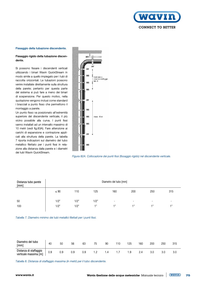 Tabella 8. Distanza di staffaggio massima (in metri) per il tubo discendente.