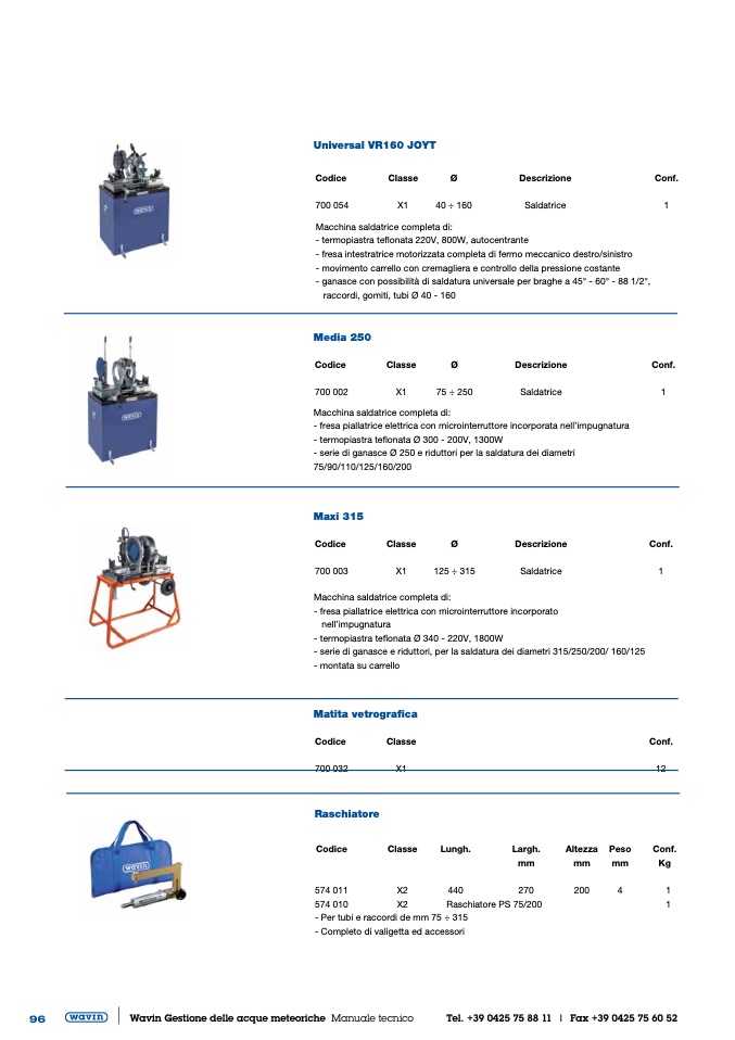 - serie di ganasce e riduttori, per la saldatura dei diametri 315/250/200/ 160/125