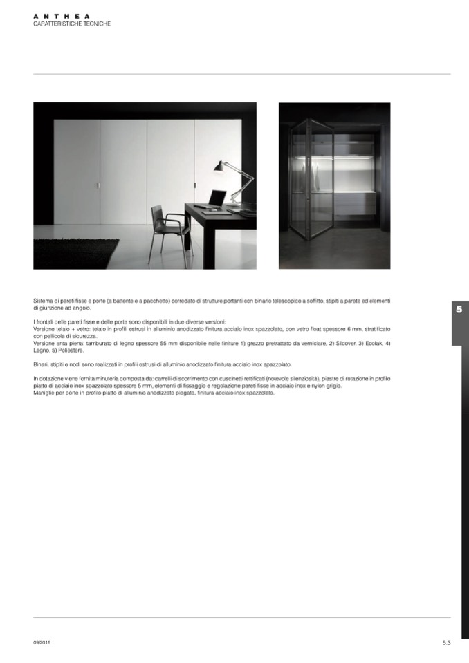 Binari, stipiti e nodi sono realizzati in profili estrusi di alluminio anodizzato finitura acciaio inox spazzolato.