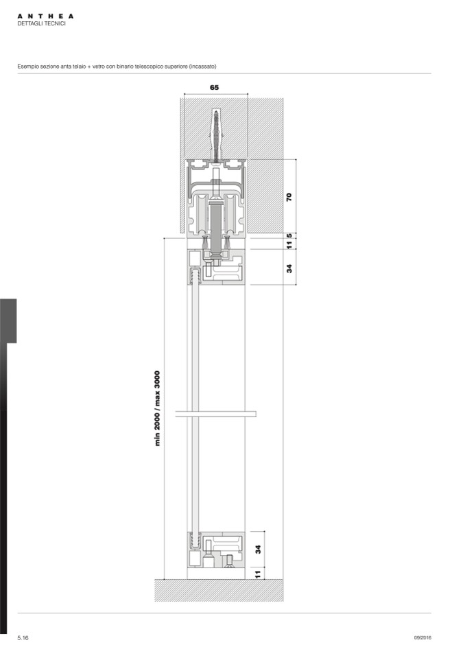 Esempio sezione anta telaio + vetro con binario telescopico superiore (incassato)