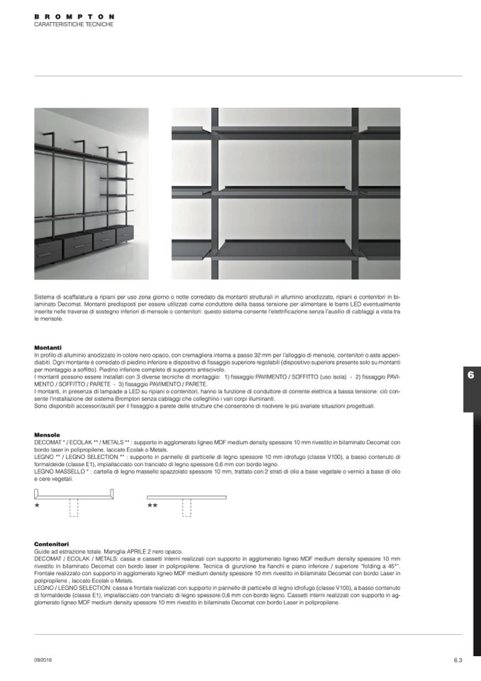 In profilo di alluminio anodizzato in colore nero opaco, con cremagliera interna a passo 32 mm per l’alloggio di mensole, contenitori o aste appen-