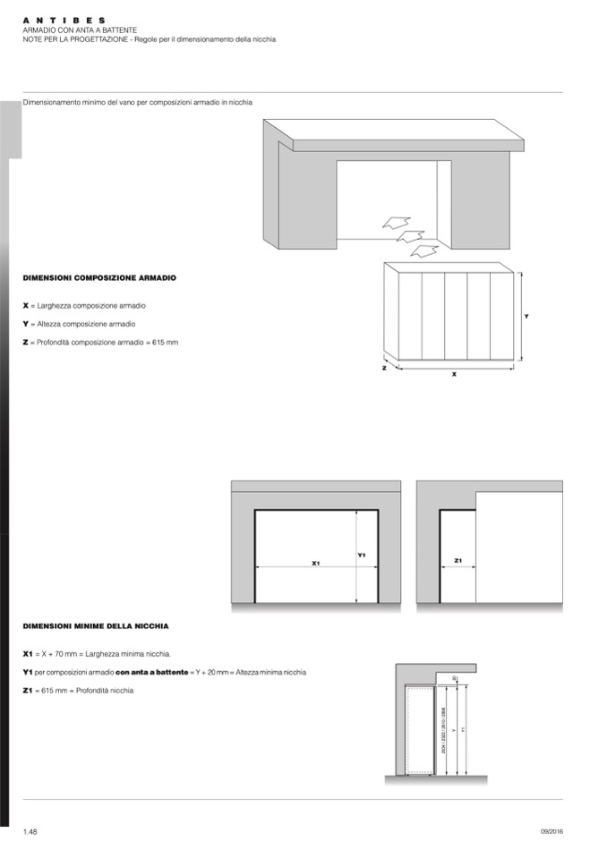 Y1 per composizioni armadio con anta a battente = Y + 20 mm = Altezza minima nicchia