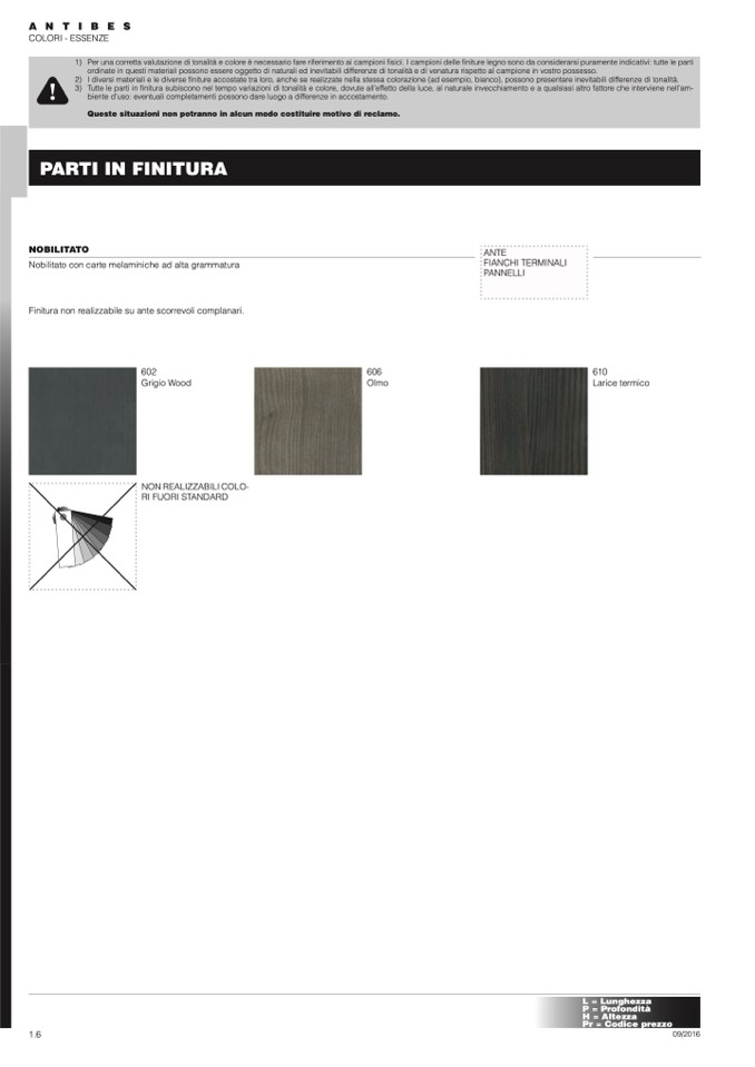 1) Per una corretta valutazione di tonalità e colore è necessario fare riferimento ai campioni fisici. I campioni delle finiture legno sono da considerarsi puramente indicativi: tutte le parti