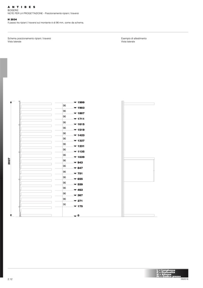 Il passo tra ripiani / traversi sul montante è di 96 mm, come da schema.