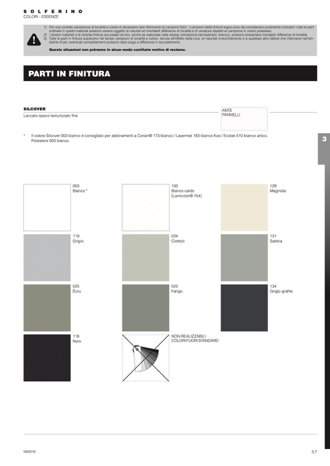 1) Per una corretta valutazione di tonalità e colore è necessario fare riferimento ai campioni fisici. I campioni delle finiture legno sono da considerarsi puramente indicativi: tutte le parti