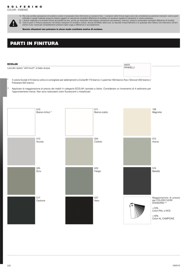 3) Tutte le parti in finitura subiscono nel tempo variazioni di tonalità e colore, dovute all’effetto della luce, al naturale invecchiamento e a qualsiasi altro fattore che interviene nell’am-