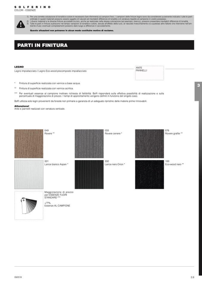 3) Tutte le parti in finitura subiscono nel tempo variazioni di tonalità e colore, dovute all’effetto della luce, al naturale invecchiamento e a qualsiasi altro fattore che interviene nell’am-