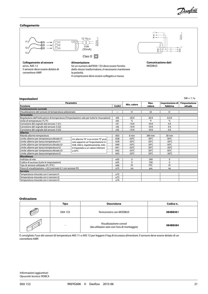 È consigliato l'uso dei sensori di temperatura AKS 11 o AKS 12 per leggere il log di sicurezza alimentare. Il sensore deve essere dotato di un